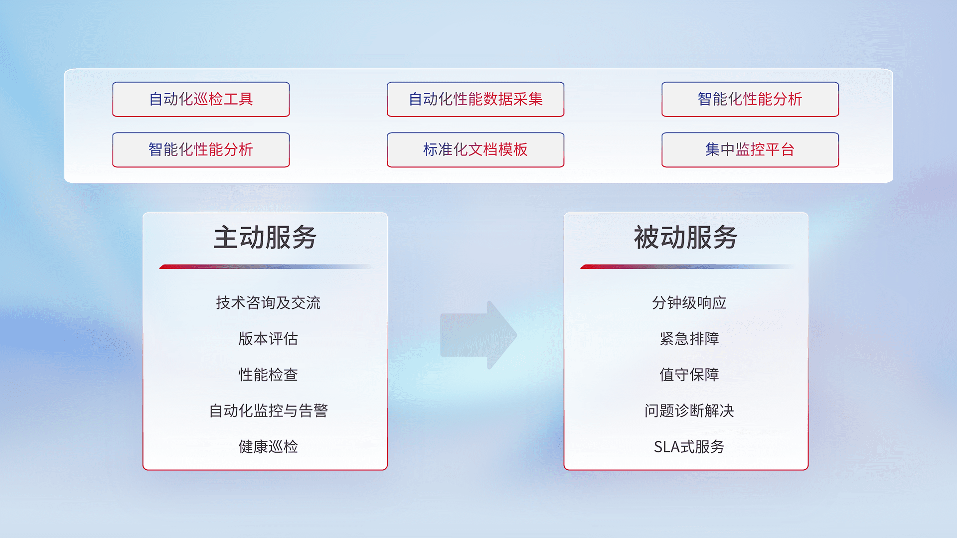 智能化工具和标准化文档,,,,保障服务质量,,,提供主动服务(包含技术咨询、、、版本评估、、性能检查、、、自动化监控与告警、、健康巡检)和被动服务包含(分钟级响应、、、紧急排障、、、值守保障、、问题诊断解决、、、SLA服务)。。。