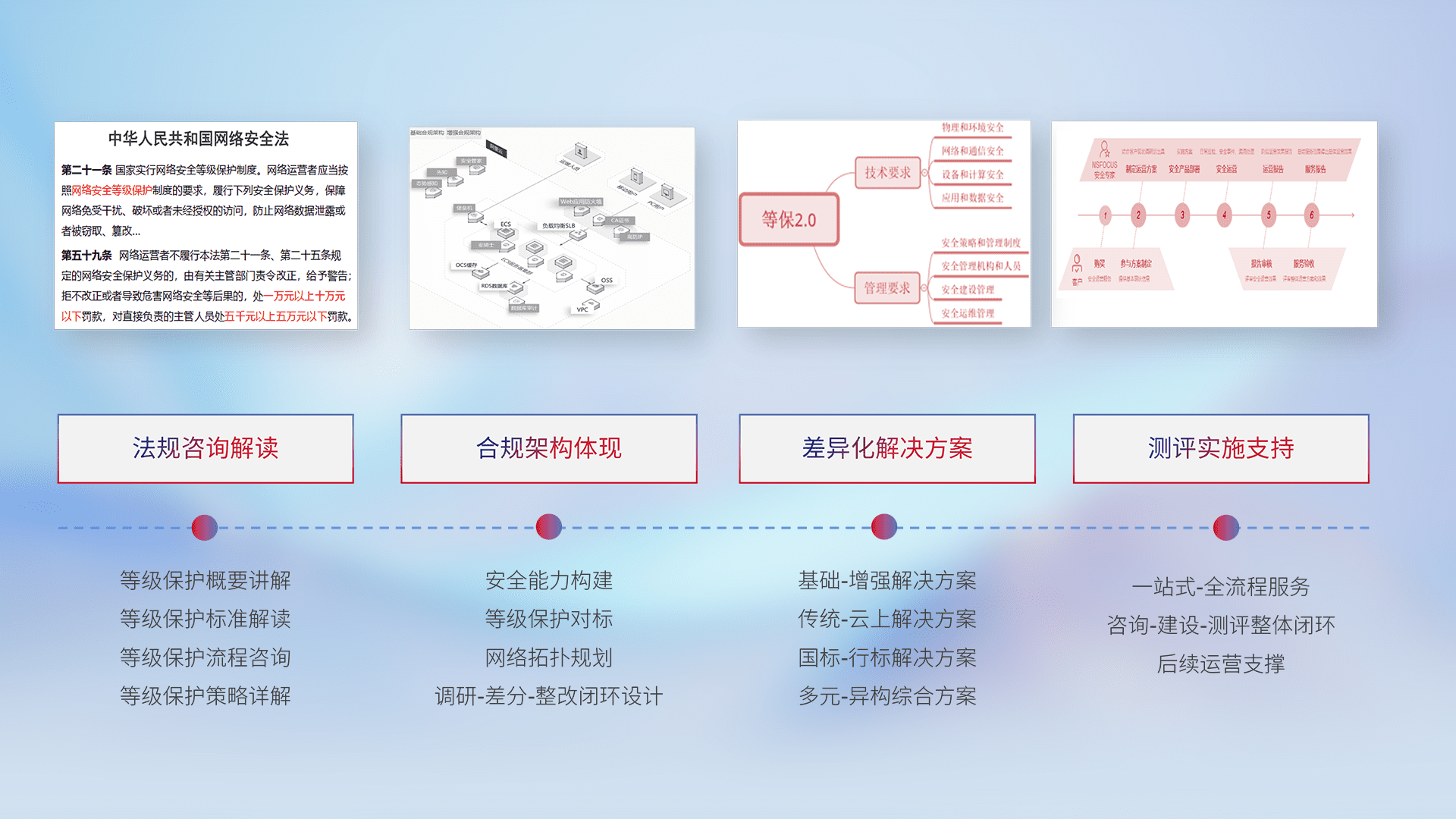 通过专业的法律咨询解读、、、、合规架构体现、、、差异化解决方案、、测试实施支持等服务,,,,为客户量身打造等保合规体系。。